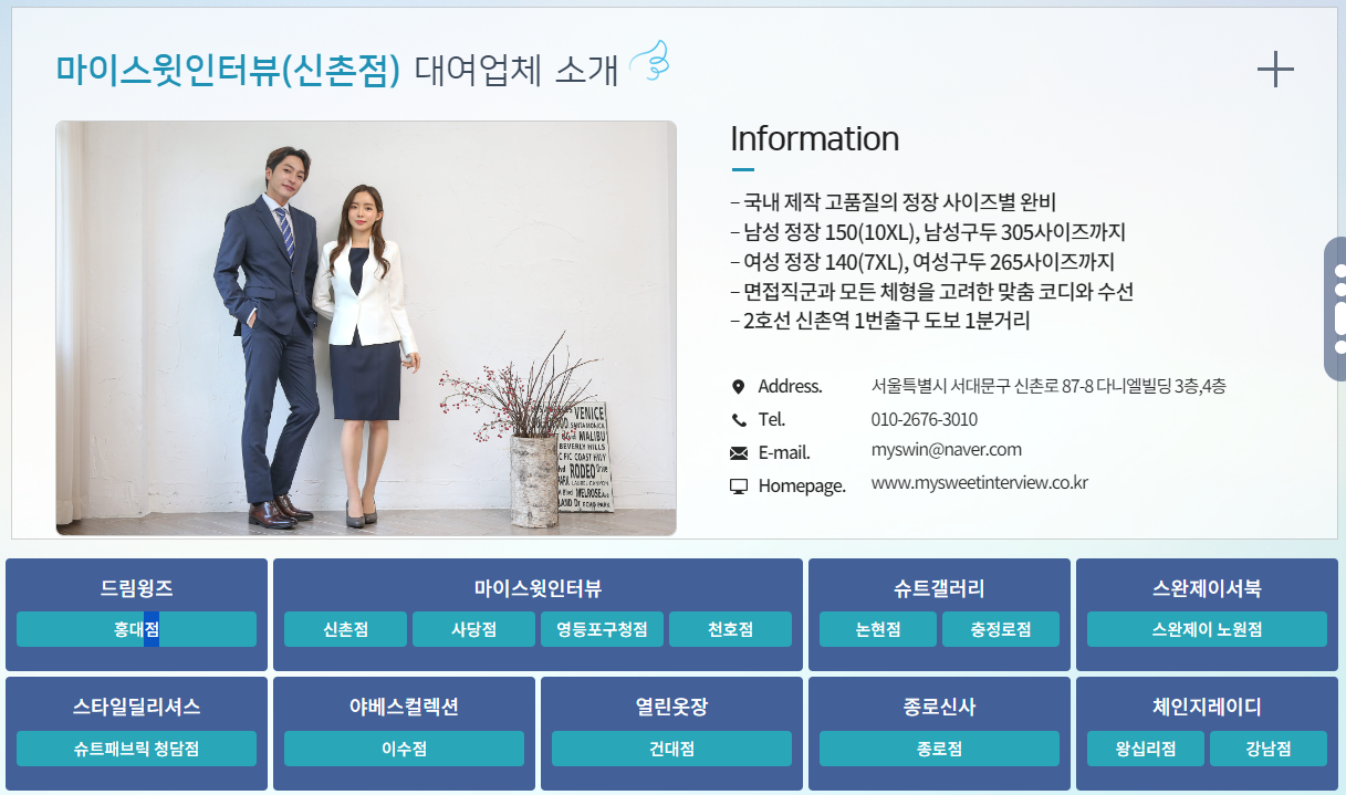 드림윙즈(홍대점) / 마이스윗인터뷰(신촌,사당,영등포구청,천호점) / 슈트갤러리(논현,충정로) / 스완제이서북(노원) / 스타일딜리셔스(청담) / 야베스컬렉션(이수) / 열린옷장(건대입구) / 종로신사(종로) / 체인지레이디(왕십리,강남)