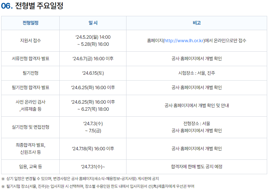 전체 채용 일정은 위와 같습니다. 입사지원 시 선택하는 필기시험 장소(서울/진주)는 입사지원서를 먼저 제출한 사람에게 우선권이 주어지기 때문에 시험 장소가 중요한 분들은 빠른 입사 지원이 필요합니다.