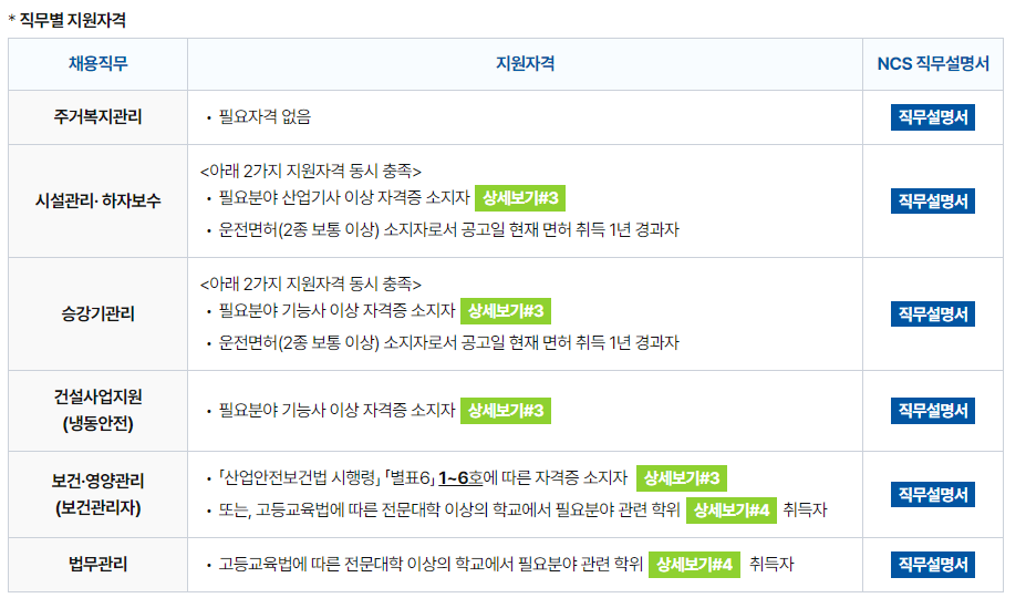 각 지원 직무별 지원자격에 대해 알아보겠습니다. 먼저, 주거복지관리의 경우 특별한 자격이 필요하지 아니합니다. 시설관리.하자보수와 승강기관리는 필요분야 산업기사 이상 자격증과 운전면허 소지자로서 면허 취득 1년 경과자여야 합니다. 건설사업지원은 필요분야 기능사 이상 자격증을 소지해야 하며, 보건관리자는 산업안전보건법 시행령에 따른 자격증 또는 전문대학 이상에서 필요분야 관련 학위를 취득한 자여야 합니다. 마지막으로 법무관리는 전문대학 이상의 학교에서 필요분야 관련 학위를 취득한 자여야 지원이 가능합니다. 자격증, 학위 관련 상세 내용은 채용 홈페이지에서 확인 가능합니다.